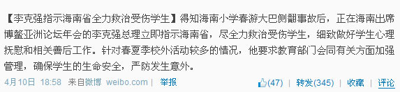 人民網北京4月11日電 (記者林露)昨天下午,國務院辦公廳政府信息公開辦公室在微博上發布消息:“得知海南小學春游大巴側翻事故后,正在海南出席博鰲亞洲論壇年會的李克強總理立即指示海南省,盡全力救治受傷學生,細致做好學生心理撫慰和相關善后工作。針對春夏季校外活動較多的情況,他要求教育部門會同有關方面加強管理,確保學生的生命安全,嚴防發生意外!