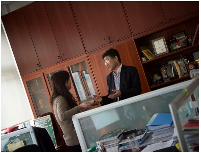 高福平時工作非常繁忙,這天記者跟著他一打開辦公室門,就有同事迎上來和他討論工作