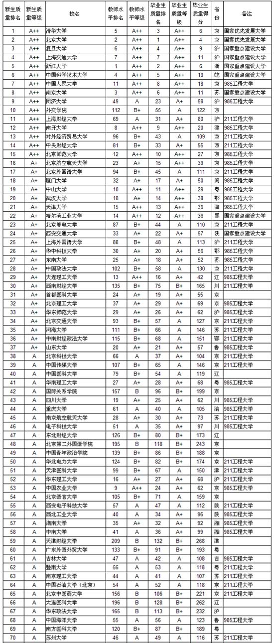 在下表的新生質量、教師水平、畢業生質量對照排行榜中,凡等級在C級及以上的,列出排名和等級,D+級及以下的只列等級,不列排名,等級相同,排名不分先后。其中的畢業生質量得分,是新生質量排名和教師水平排名相加之和,畢業生質量得分相同的,按教師水平排名排列。