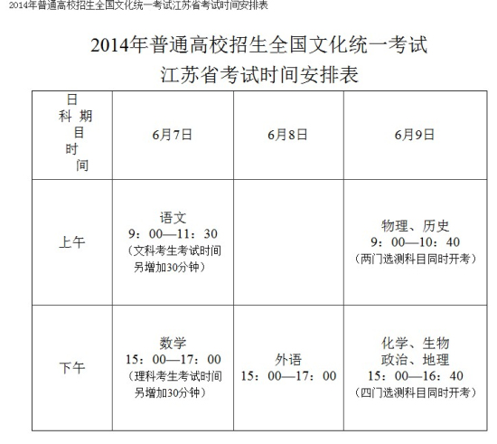 2014年普通高校招生全國文化統一考試江蘇省考試時間安排表