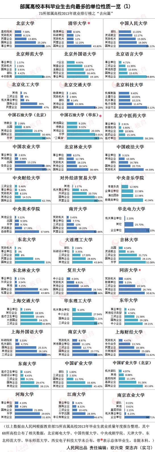 人民網北京5月20日電 (歐興榮 實習生榮志卉)高校畢業生就業都去了哪兒?近日,人民網根據教育部75所直屬高校發布的2013年畢業生就業質量年度報告,整理相關數據,編發本科畢業生去向最多的單位性質分析表,讓我們略窺一二。