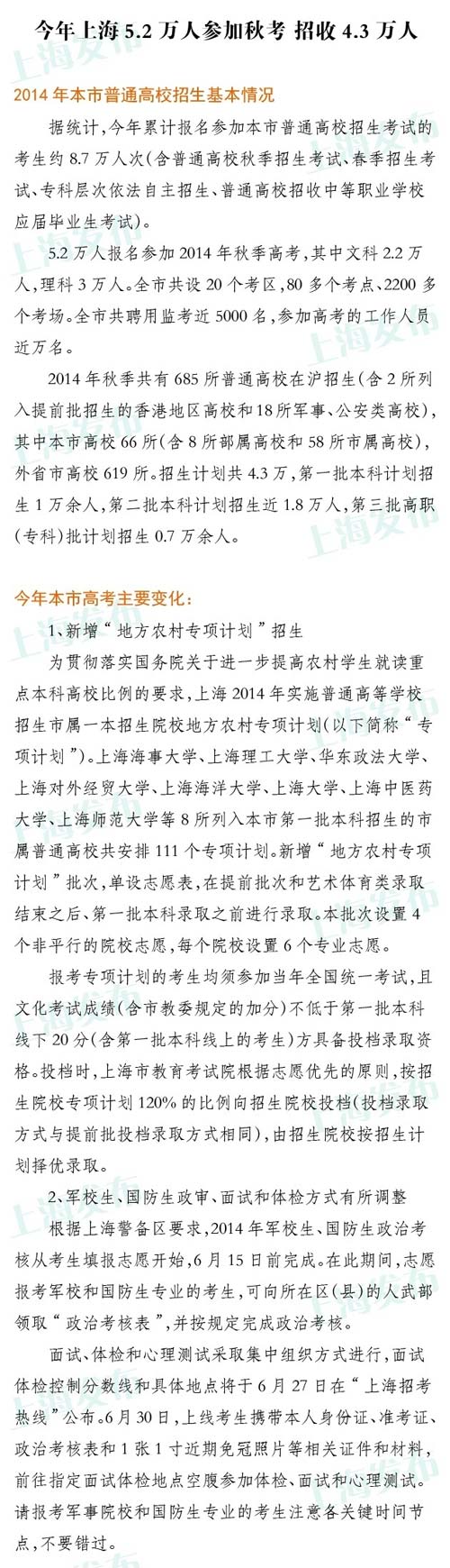 原標題:2014上海高考報名人數5.2萬 招生計劃4.3萬