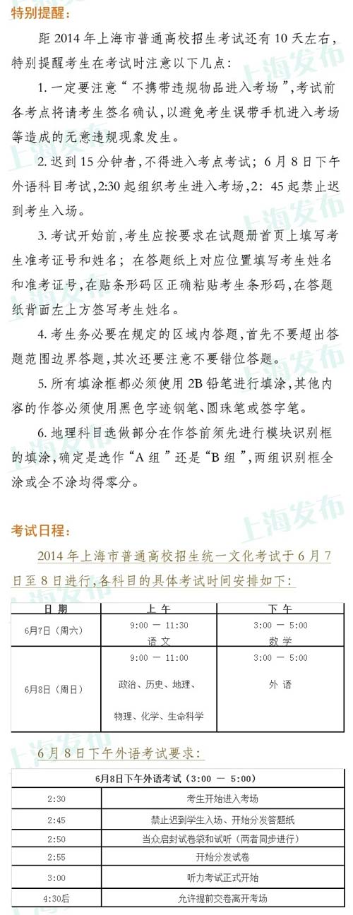 上海高考倒計時只有10天了。據上海市政府新聞辦消息,5.2萬人報名參加2014年秋季高考,招生計劃4.3萬,其中一本招1萬余人,二本招近1.8萬人。6月7日(周六)上午語文,下午數學;6月8日(周日)上午政治、歷史、地理、物理、化學、生命科學,下午外語。