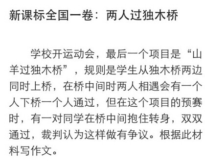 @Vista看天下:#高考作文吐槽#新課標全國第一卷的山羊過獨木橋,倆人相遇抱住轉身,裁判認為有爭議,多好的題目,為何有些同學關注點在抱住的是不是倆男生,喂,你們關注點也太奇怪了…