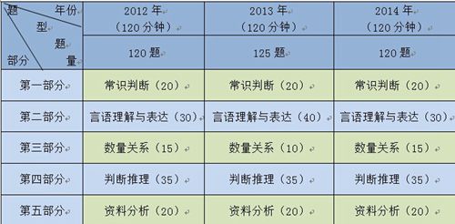 同2012和2013年相比,2014年資料分析部分題量仍為20道,依然是考查了文字材料,表格材料、圖形材料和綜合材料。在考查考生計算能力的同時,題目的問法更加新穎,對考生理解能力要求提高。做資料分析題目需要謹慎,看清提問方式和選項,運用自己掌握的計算方法。