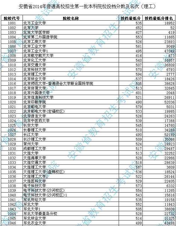 2014年安徽省本科第一批錄取院校投檔線【7】
