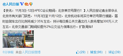 據人民日報官方微博消息,今年11月APEC會議在京召開期間,除會議保障部門,維持城市運行部門,在京中央國家機關事業單位、社會團體及北京事業單位、社會團體,7日-12日放假6天。其中,11月7日(星期五)、10日(星期一)放假,11月11日(星期二)、12日(星期三)調休,11月2日和15日上班。此外,11月3日至11月12日,北京將實行單雙號限行措施,會議期間,國家會議中心、雁棲湖會場周邊道路將進行安檢和交通管制。
