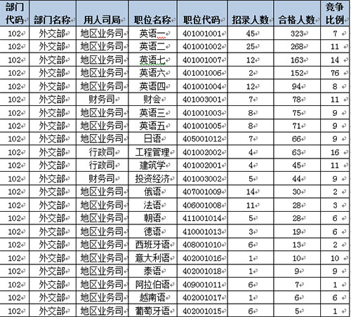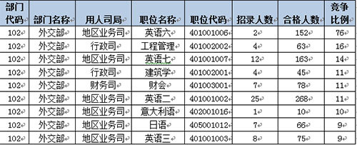 外交部競爭最激烈的職位是地區業務司的英語六一職,僅招錄2人。截至17日16時,已有152人通過了審核,競爭比高達76:1。該職位的工作主要是研究國際陸地、海洋邊界方面的外交實踐;處理有關邊界涉外事務及領土、地圖、地名等涉外案件;參加與鄰國陸地邊界劃界、勘界、聯合檢查及日常管理工作;參與海洋劃界、共同開發等相關外交談判工作。