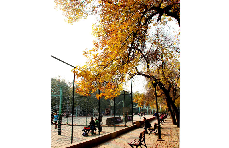 黃金樹下,籃球場上,揮灑汗水練體魄!”本┱Z言大學董昕航攝影