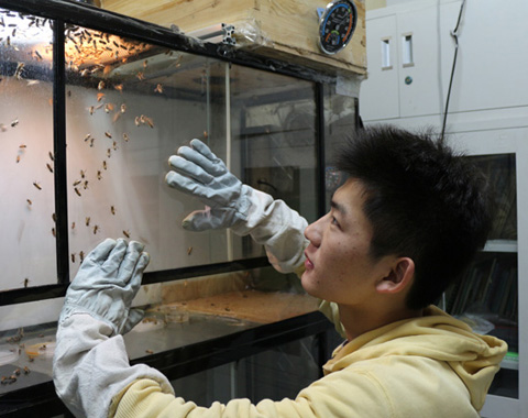 但如何讓“尊貴矯情”的蜜蜂小姐開口喝水,卻把楊珩難住了,他嘗試把蜜蜂用老鼠貼粘在玻璃片上,把蜜蜂胡亂揮舞的手腳束縛起來,把蜜蜂放在一個小盒子里只開一個喝水的小孔等等,均以失敗告終。就這樣,楊珩從早晨嘗試到傍晚,不吃不喝地逗蜜蜂喝水,手被蜜蜂蟄腫了,仍沒有成功。挫敗感并沒有打敗楊珩,最后的堅持讓他幸運地遇到了一只給力的蜜蜂,它瘋狂地喝水,使楊珩從各個角度清晰地觀察了“蜜蜂喝水”的一舉一動,拍攝到了珍貴的視頻資料!斑@個實驗完成后,我們欣喜若狂,把蜜蜂都放生了,盡情地讓蜜蜂蟄我們!也許,熱愛自然,堅持信念的人,老天也會給我們好運吧!”直到現在,我們仍能感到楊珩成功的喜悅。