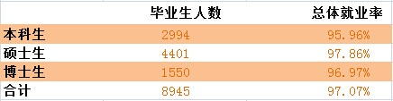 其中校本部各類畢業生合計7388人,總體就業率為97.51%,含國內升學(19.78%),出國(境)留學(16.40%),和直接就業(61.33%)。