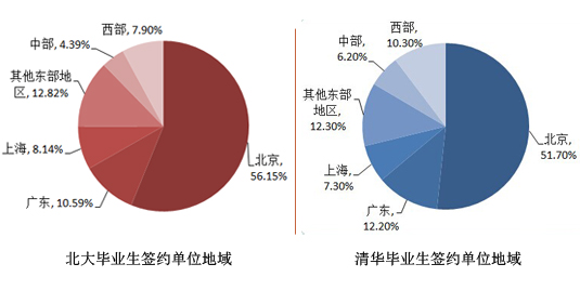 從國內就業畢業生去向地區來看,兩校學子都愛留京,所占比例分別達到56.15%和51.70%,此外廣東和上海也對兩校學子有一定的吸引力,其他東部地區兩校差距不大,而去往中西部地區的畢業生中,清華高于北大。