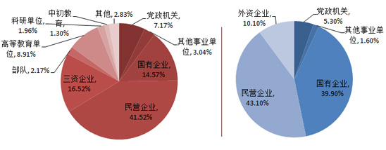 北大對去向單位性質的分類做的比較詳細,清華相對而言略粗曠,數字對比發現,兩校學子去往最多的單位性質是民營企業,清華學子更愛國企,而北大去往教育科研機構單位的比例比清華的高。