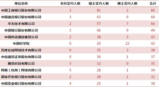 北大只列出了去向單位的前12名,前五位的分別是工商銀行、建設銀行、華為 、中國銀行 和中國移動,銀行占了三家。