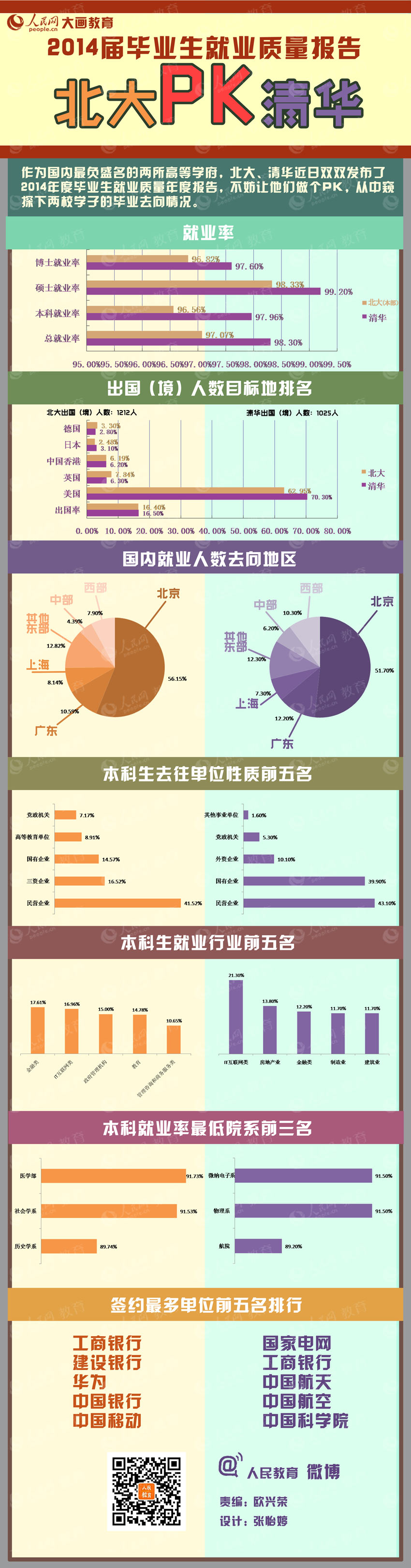 人民網北京1月7日電(歐興榮 實習生張怡婷)作為中國最負盛名的兩所高等學府,北大、清華兩校及學子的動向備受社會關注,近日兩校發布的2014年畢業生就業質量年度報告顯示,不妨讓它們做個PK,看看到底哪家強?!
