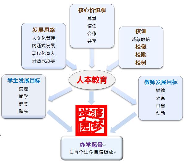 學校堅持理念引領,確立了“讓每個生命自信綻放”的辦學愿景,確定以“人本教育”為核心,以師生的共同發展為本,激發每個人發展的潛力,讓每個學生樹立自信。弘揚“誠毅敏信”的校訓精神和“尊重、信任、合作、共享”的核心價值觀,立德樹人,培育和踐行社會主義核心價值觀,堅持“人文化管理、內涵式發展、現代化育人、開放式辦學”的發展思路,構建生活化、多樣化、生態化的“學園課程體系”,打造樹德、求真、自省、創新的智慧教師,培養崇理、尚學、健美、陽光的幸福學生,把學校建設成為點燃夢想、實現夢想的追夢學園,讓學生敢于有夢、勇于追夢、勤于圓夢,讓每個生命在追夢學園里自信綻放。