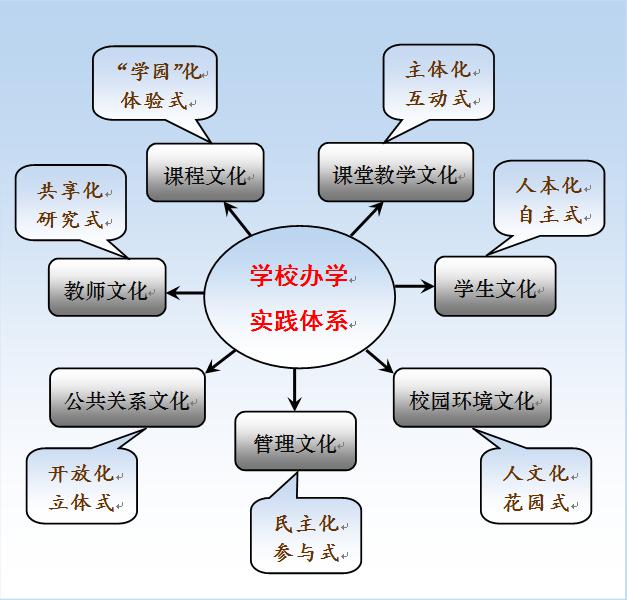 教育學和管理學都是人學,教育就是以文化之。簡單理解,學校文化中的“文”就是辦學理念,“化”就是通過管理把辦學理念滲透在方方面面,用文化浸潤師生心靈。結合山區礦區寄宿制學校的實際情況和生源特點,學校堅持尊重個體差異,充分開展“人本教育”,以人為本,促進教師專業化發展,激發學生的興趣和活力,開闊學生的思維和視野,點燃學生的夢想和激情,逐步形成了以促進師生共同發展為目標的“一化一式”的特色辦學實踐體系,包括“學園”化與體驗式的課程文化、主體化與互動式的課堂教學文化、共享化與研究式的教師文化、人本化與自主式的學生文化、開放化與立體式的公共關系文化、民主化與參與式的管理文化、人文化與花園式的校園環境文化等。