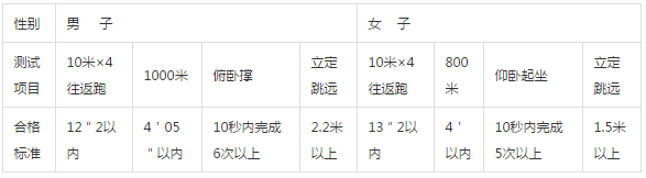 凡報考我校的考生,必須參加體能測試,成績合格(合格標準所稱以上、以內,均含標準本數)。具體見以下表格: