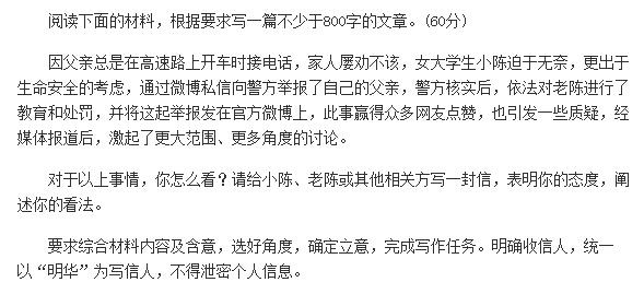 今年新課標全國一卷的作文材料引用了發生于2015年5月7日的一個小故事。當天湖北高速交警官方微博接到一條特殊的微博舉報,一位女網友向警方舉報自己父親在高速公路上開車接打電話。湖北省高警總隊經過調查,證實被舉報人和舉報人確實是父女關系,其父承認接打電話的違法事實。警方對被舉報的父親依法進行教育處理,對舉報交通違法的女兒按照規定進行了獎勵。而舉報人@愛心菇娘告訴值班博警,"因為爸爸的這個習慣實在很不好,家里說了很多次他也不聽,我實在很擔心她的安全。"