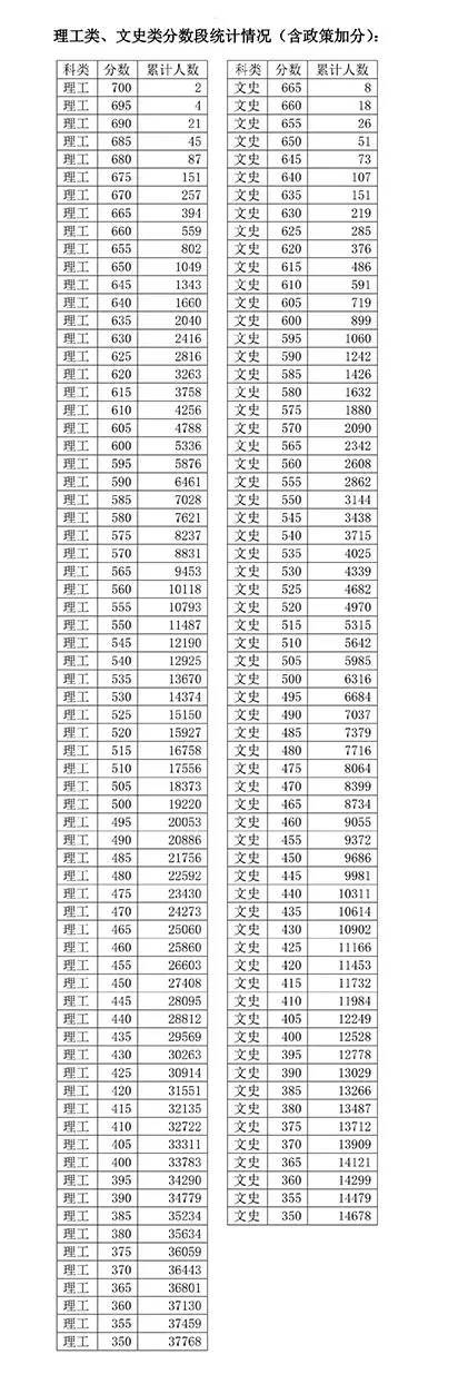 天津2015高考理工類、文史類分數段統計情況(含政策加分)