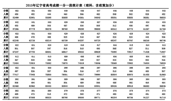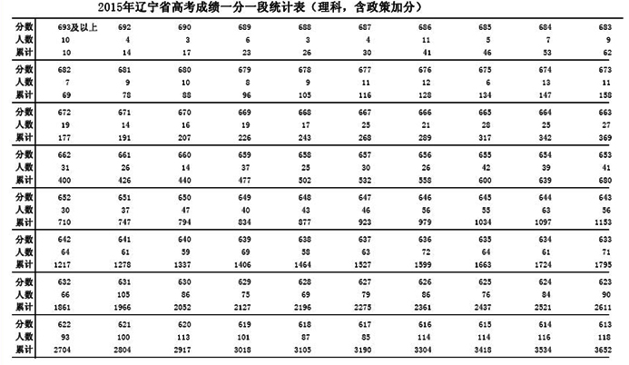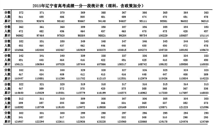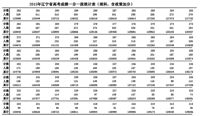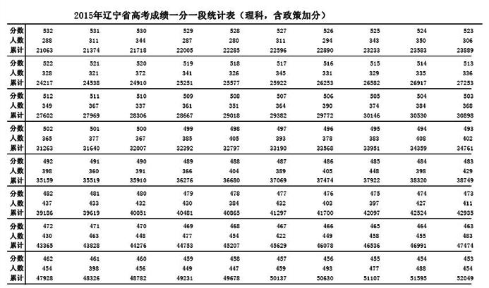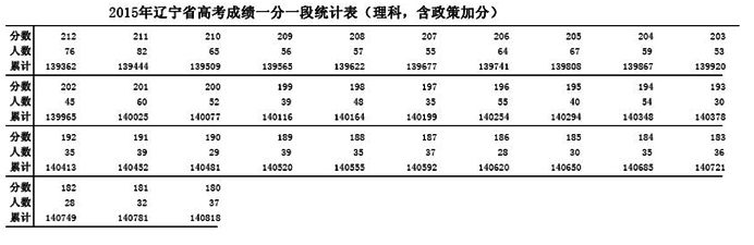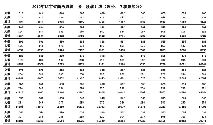 2015年遼寧省高考理科成績一分一段統計表(含政策加分)