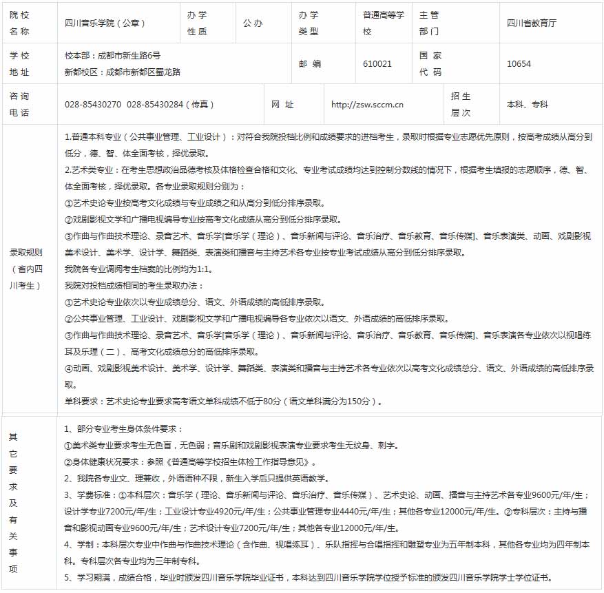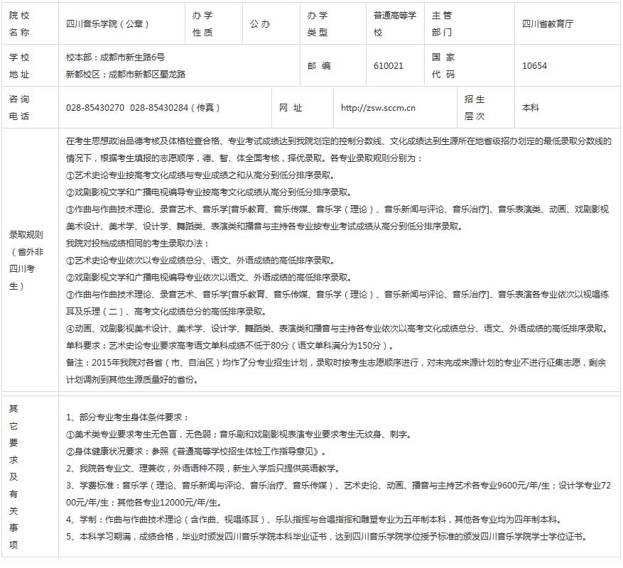 四川音樂學院2015年招生章程(省外)