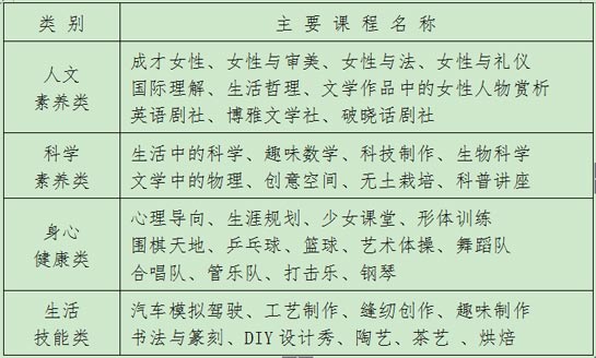 根據新課程相關文件精神,從我校辦學理念、培養目標和辦學特色出發,修訂了《校本課程開發與實施方案》,確立了校本課程由人文素養、科學素養、身心健康、生活技能等四大類構成。初中以“自選課”為主,“必選課”為輔,滿足女學生的興趣發展,合理建構校本課程體系。不斷提升學生的素質、修養,為學生打好人生的底色。