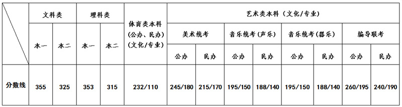 2.除29所獨立設置本科藝術院校和清華大學等13所院校以外的其他院校本科?紝I的省最低控制分數線:公辦、民辦均為文化188分/專業合格。其中,取得音樂學、繪畫、中國畫、美術學、視覺傳達設計、環境設計、產品設計、服裝與服飾設計專業?己细窨忌,還須參加相應專業省統考,且美術省統考成績須達到150分,音樂省統考成績須達到115分。