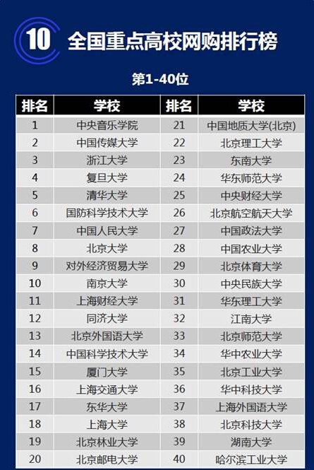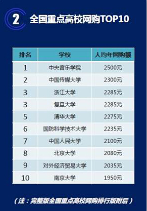 報告數據顯示,全國重點大學生年均網購額為1100元,人均年收到的包裹數為16.2個。而在全國重點高校中,中央音樂學院、中國傳媒大學、浙江大學分列前三;年人均花費2500元的中央音樂學院排行居首。