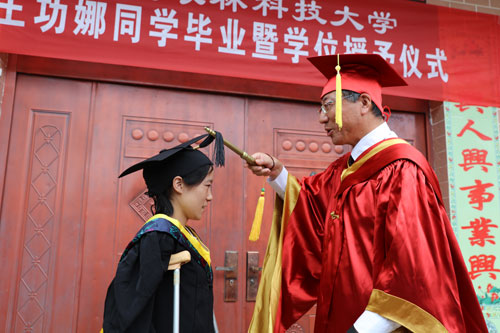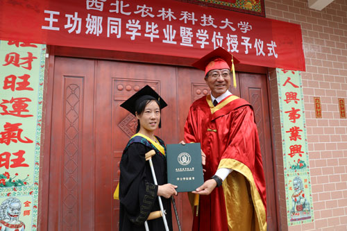 人民網北京6月27日電(熊旭 楊遠遠)昨天,在距離西安市400多公里的商洛市柞水縣杏坪鎮中山村,舉行了只有一名學生參加的特殊畢業典禮。身著學位服的西北農林科技大學學位委員會主席孫其信校長,頂著炎炎夏日,驅車5小時,親手為因意外而殘疾的王功娜同學撥穗、頒發學位證書,并代表學校贈送一萬元慰問金。