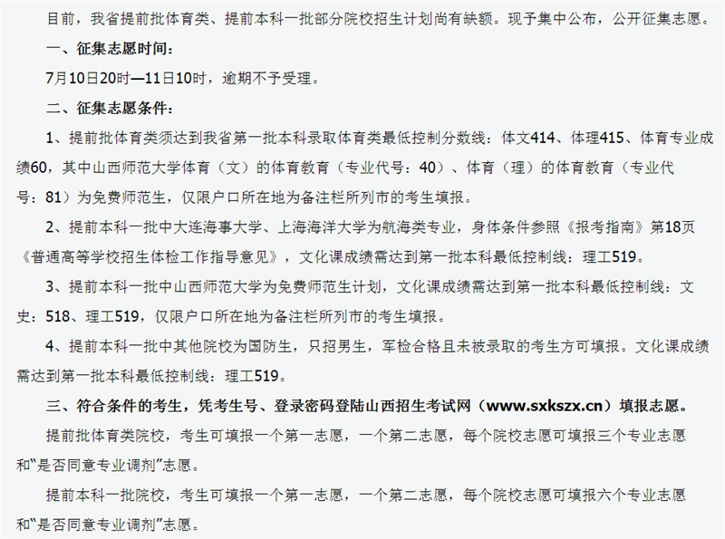 人民網北京7月11日電(記者林露 實習生溫雪茹)2016年山西高考提前批體育類、提前本科一批仍有缺額,現公開征集志愿: