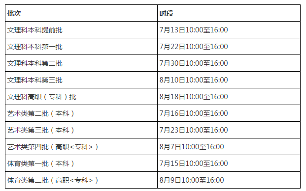 ①6月26日8:00至27日17:00:文理科本科提前批次(包括國家專項計劃、地方專項計劃、自主招生<含高校專項計劃>)、高職(?)提前批和藝術、體育類各批次。