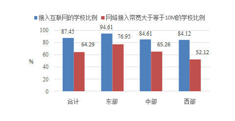 圖3 2016年東中西部地區接入互聯網的中小學比例情況