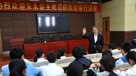 朱永新在學軍中學與同學們交流(圖片來源:杭州學軍中學)