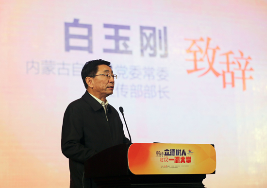 白玉剛說,近年來,內蒙古的高等教育特別是高校思想政治工作,取得了長足的進步。全面推進立德樹人這一根本任務,在全區各高校積極開展中國夢和中國特色社會主義的宣傳教育,大力弘揚社會主義核心價值觀,持續深化德育先導、以文化人、敦品勵學、成才圓夢等主題實踐活動,持續開展大學生桃李之星和高校育人之星評選表彰活動。每年在全區高校開展高雅藝術進校園、精品文藝高校巡演,優秀微電影評選展播等一系列文化活動,為筑牢祖國北方邊疆、意識形態安全屏障,培養合格的社會主義建設者和接班人做了積極的探索和努力。