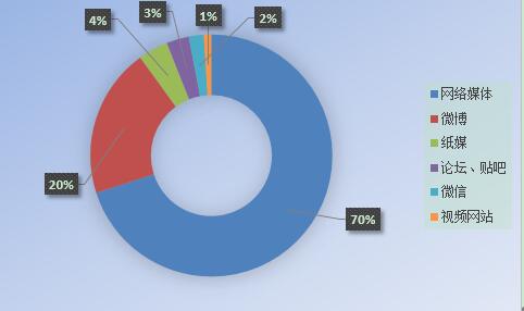 從媒介參與度上來看,主要是傳統媒體、網絡媒體、微博、微信、論壇、貼吧。研究發現,網絡媒體占比約為70%,其次是微博占比約為20%,紙媒占比4%,論壇、貼吧占比3%,微信占比2%,視頻網站1%。