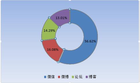 2015-2016年度,全國126所高校網絡輿論關注度總量中,微信關注度最高,占比56.62%;微博次之,占比16.08%;論壇、博客占比最低,分別為14.29%、13.01%。雙微平臺對于高校關注的總量占到全部份額的八成多,說明微博、微信等新興社交媒介在現階段影響力較大,論壇、博客等傳統社交平臺漸已式微。