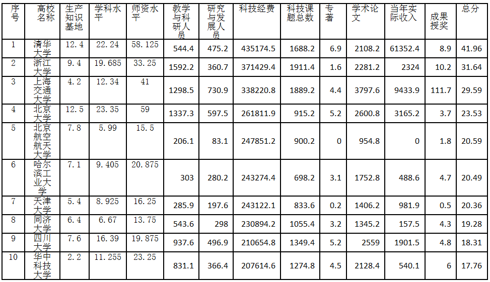 高?蒲杏绊懥ρ芯恐笜,我們根據教育部《2015年高等學?萍冀y計資料匯編》及各高校公開數據,選取了生產知識基地、學科水平、師資水平、教學與科研人員、研究與發展人員、科技經費、科技課題總數、專著、學術論文、技術轉讓當年實際收入、成果授獎共十一個指標。通過對這十一項科研因子選項的研究,清華大學、浙江大學、上海交通大學、北京大學、北京航空航天大學、哈爾濱工業大學、天津大學、同濟大學、四川大學、華中科技大學位居全國高?蒲杏绊懥η笆。