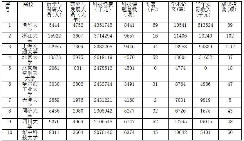 從上表可以觀察到清華大學在多項指標中位居首位,如科技經費、科技成果專著、論文、技術轉讓方面的當年實際收入等。多項核心指標反映了清華大學在科研影響力方面雄踞全國高校之首的強大實力。