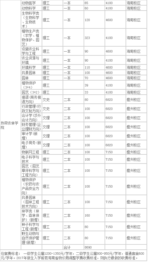 住宿費標準: 一級學生公寓1200-1350元/學年,二級學生公寓800-950元/學年,普通宿舍600元/學年。2017年新生入學前若海南省物價局調整學費收費標準,則執行最新的收費標準。