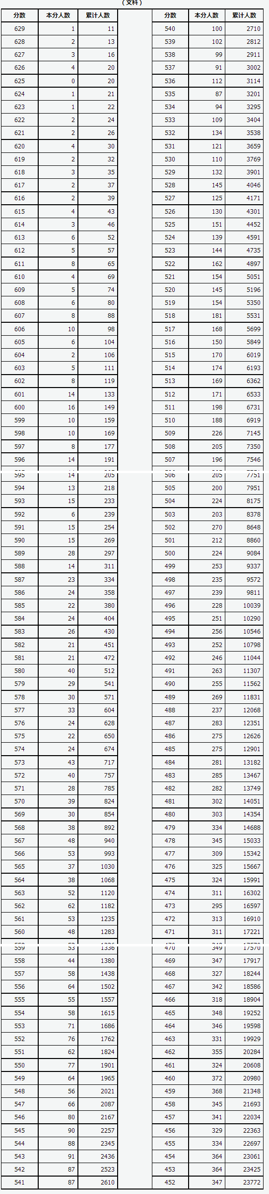 2017年山西省高考成績分段統計表(文科)詳細如下: