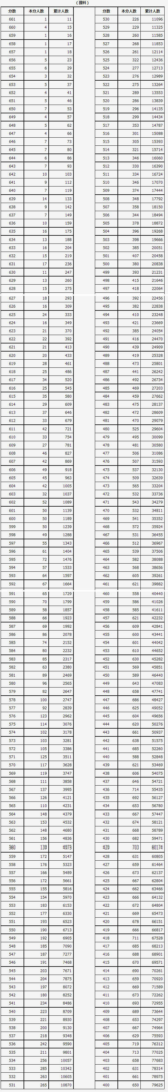 2017年山西高考理科分數段統計表