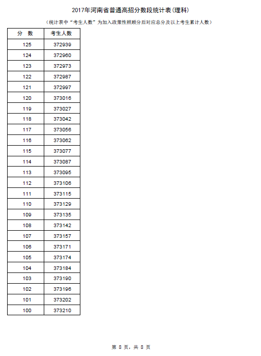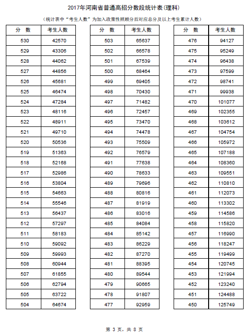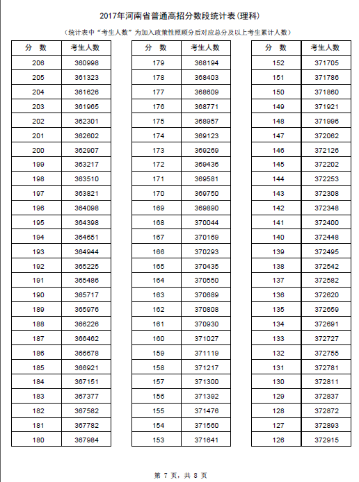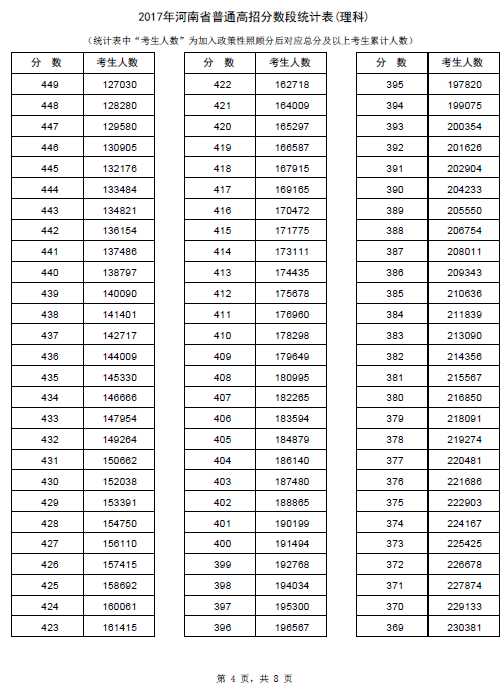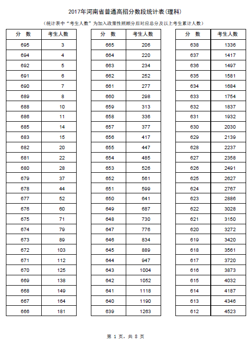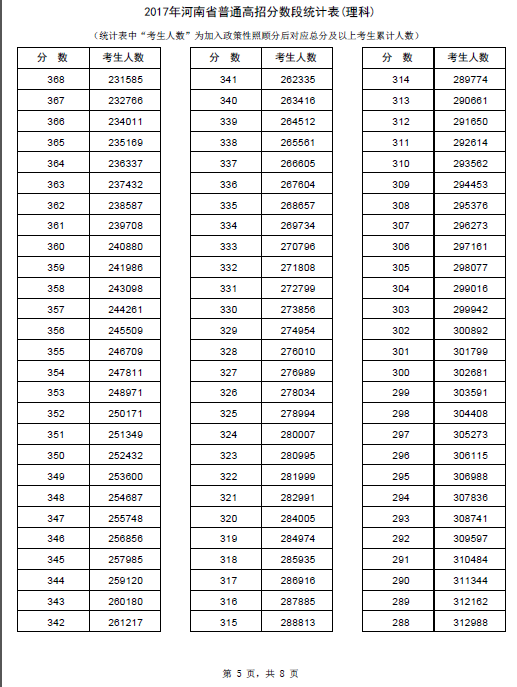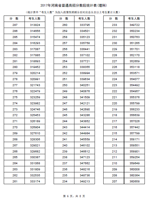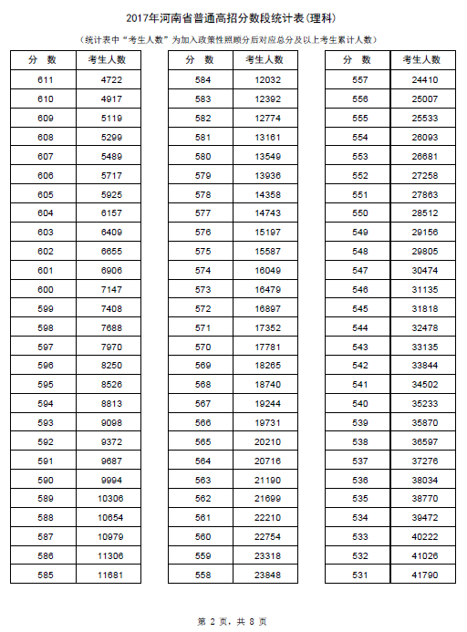 2017年河南省普通高考理科類分數段統計表詳細如下: