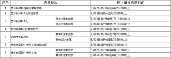 2.藝術類。本科提前批實行院校志愿“一檔多投”。本科A批、B批均實行專業志愿“一檔多投”。高職(?)批實行專業志愿平行投檔。