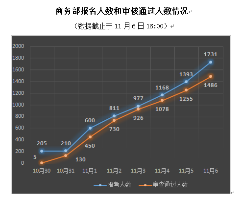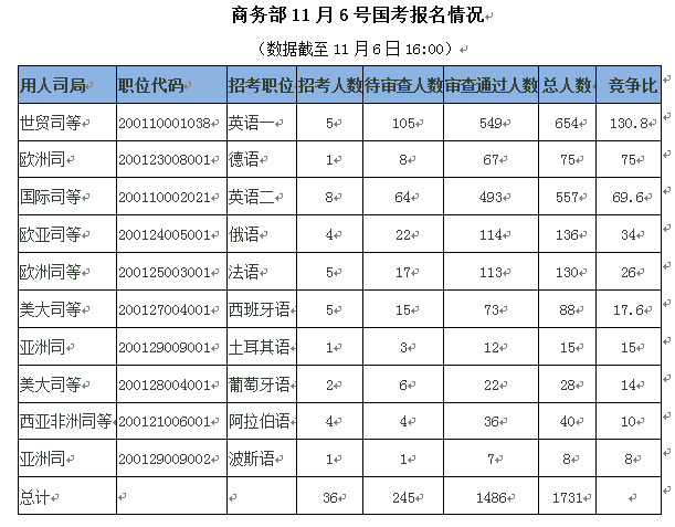 人民網北京11月7日電 (張歌)昨日是國考報名第八天,商務部報名開始步入高峰期,截至11月6日下午四點,商務部共有1731人報名,1486人通過審核,245人等待審核中。商務部今天的競爭最激烈的崗位依然是世貿司等的英語一(職位代碼200110001038),最高競爭比達130.8:1。