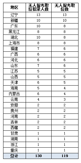 通過統計數據可以看到,工作地點在遼寧省的職位無人報名數量最多,共有13個職位,其次是西新疆和廣東,而考生報考浙江、甘肅、湖南和重慶兩地的“熱情”相對“高漲”,只有1個職位無人報考。