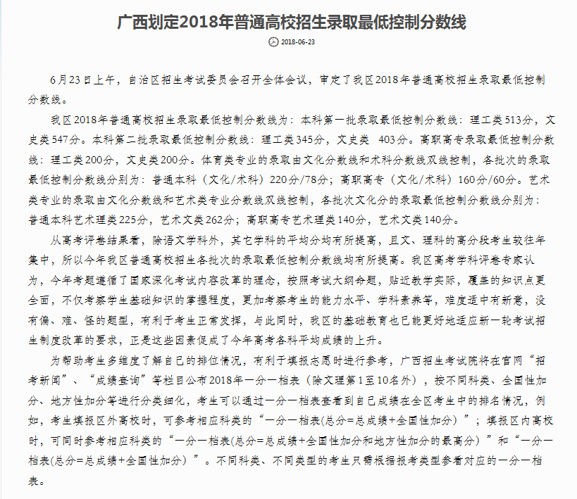人民網北京6月23日電 今天,廣西考試院公布廣西2018年普通高等學校招生錄取最低控制分數線,本科一批錄取控制分數線:文科547分,理科513分;本科二批錄取控制分數線:文科403分,理科345分。(劉婧婷)