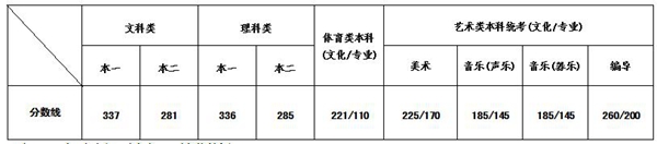 2.除獨立設置本科藝術院校和參照獨立設置本科藝術院校招生的院校以外的其他院校本科?紝I的省最低控制分數線:文化185分/專業合格。其中,取得音樂表演、音樂學、作曲與作曲技術理論、廣播電視編導、美術學、繪畫、雕塑、中國畫、實驗藝術、藝術設計學、視覺傳達設計、環境設計、產品設計、服裝與服飾設計、公共藝術、工藝美術、數字媒體藝術、藝術與科技、陶瓷藝術設計專業?己细竦目忌,還須參加相應專業省統考,且美術省統考成績須達到160分,音樂省統考成績須達到120分,編導省統考成績須達到190分。