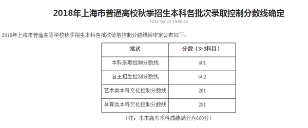 人民網北京6月24日電 23日,上海市公布2018年普通高等學校秋季招生本科各批次錄取控制分數線,本科錄取控制分數線為401分,自主招生控制分數線為502分。(李依環)