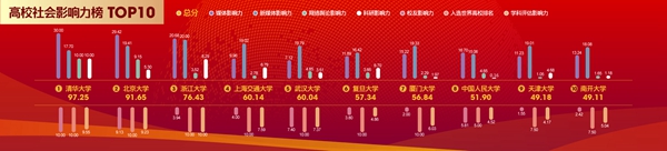 首先發布的是高校社會影響力榜單。清華大學、北京大學、浙江大學、上海交通大學、武漢大學、復旦大學、廈門大學、中國人民大學、天津大學、南開大學,位居本年度高校社會影響力排行榜前十位。從各子項來看,清華大學在多項細分項中拔得頭籌。北京大學除了在媒體影響力、新媒體影響力等方面表現亮眼以外,在校友影響力方面也有著不俗的實力。浙江大學在媒體影響力、科研影響力等多個方面位居前列。
